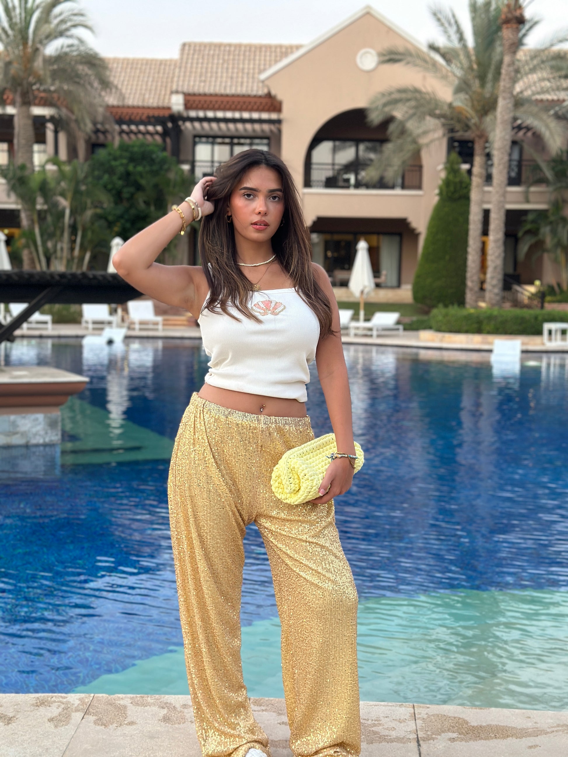 Step into effortless elegance with our Noir Sparkle Pants - a one-size statement piece designed to fit up to 75 kg. These black wide-leg pants shimmer subtly with sequin detailing, catching the light just right for evenings out or chic lounge looks. The stretchy waistband ensures comfort without sacrificing style.