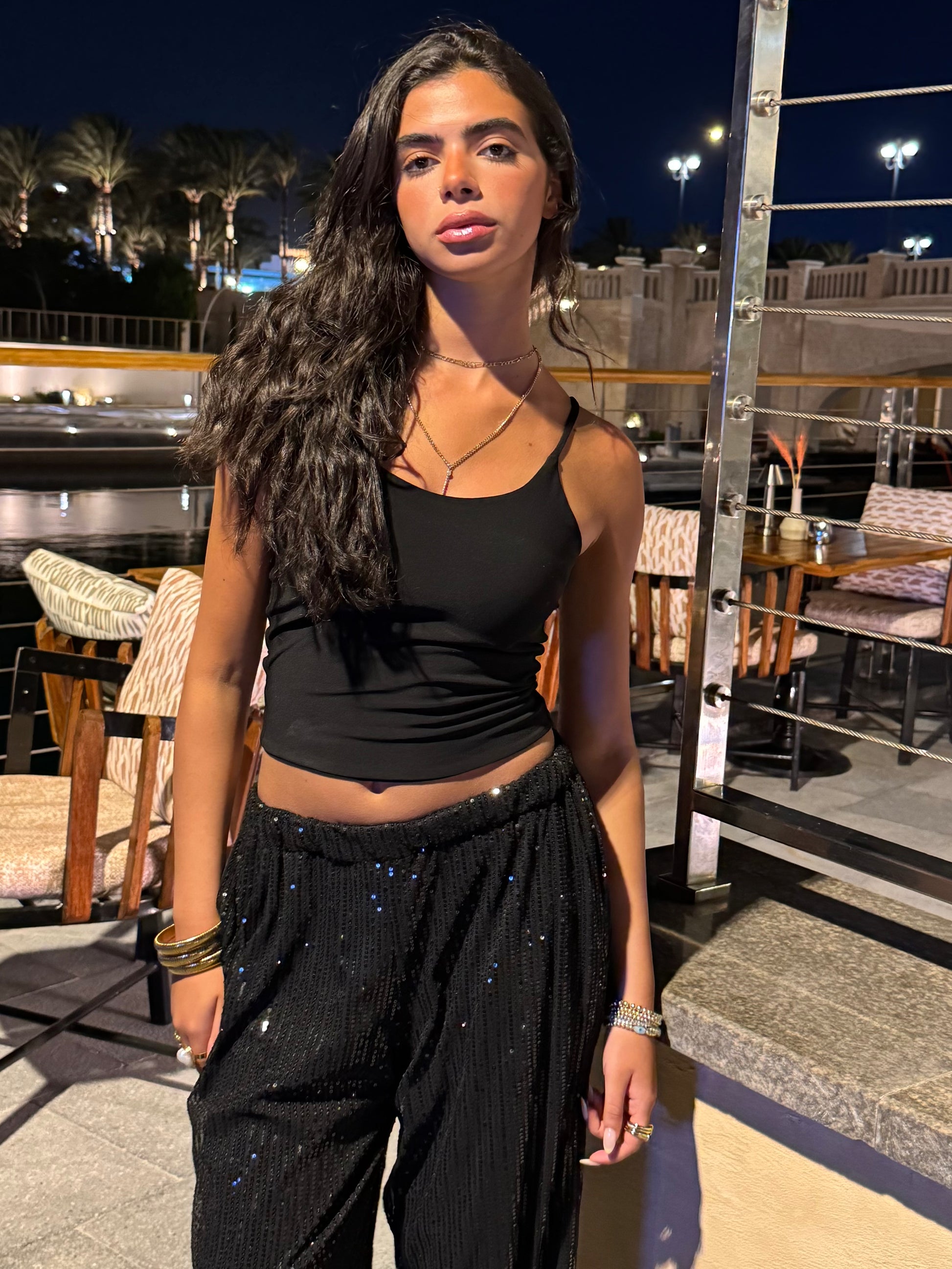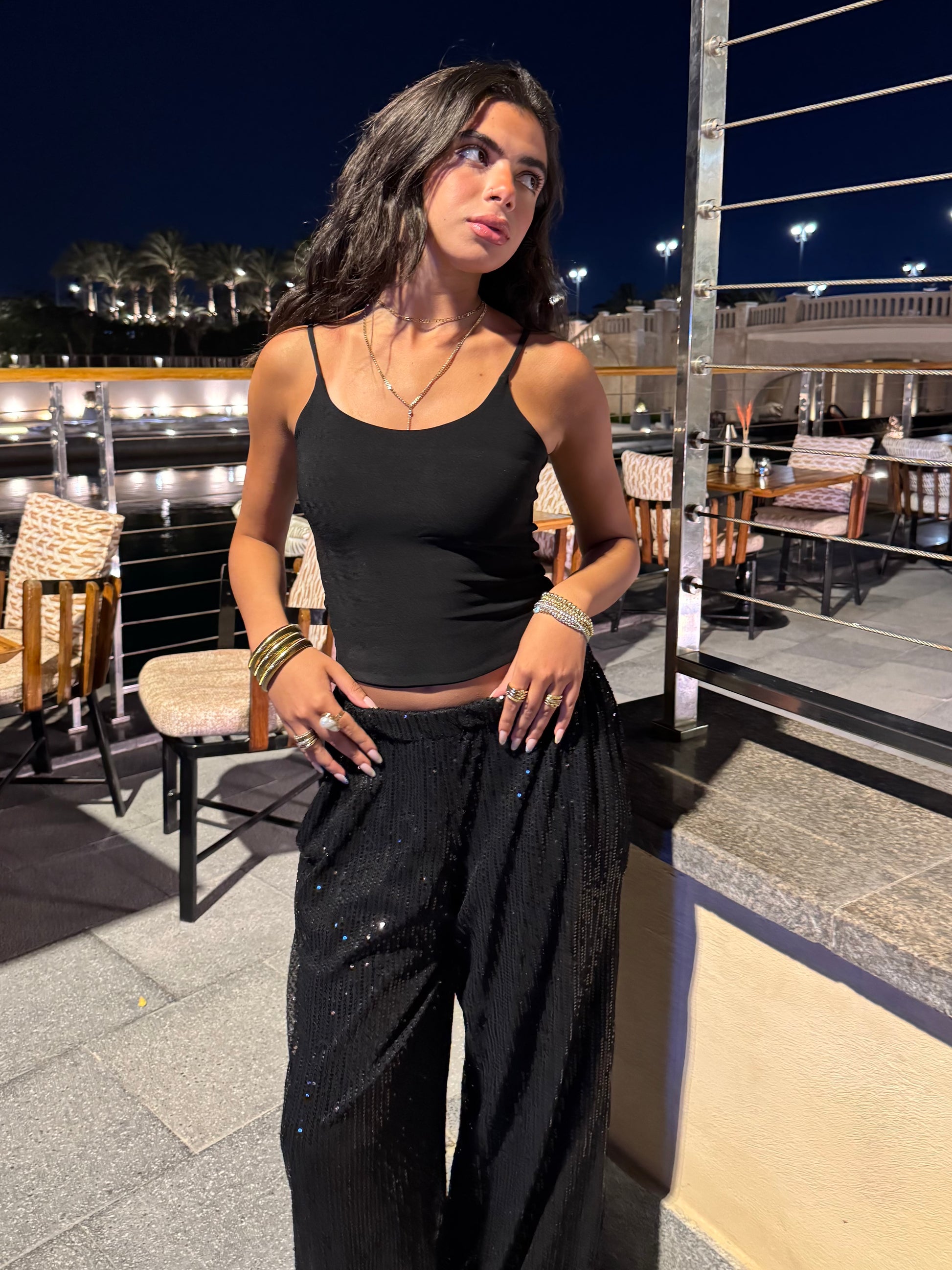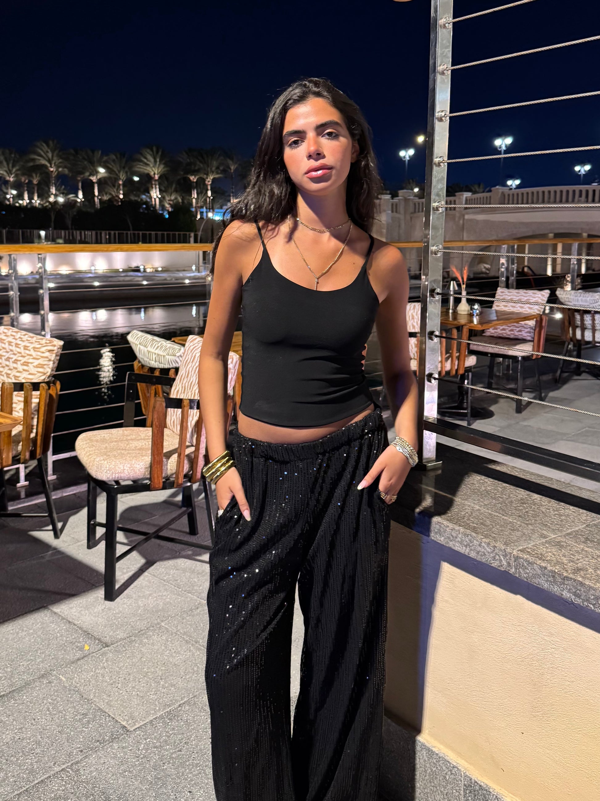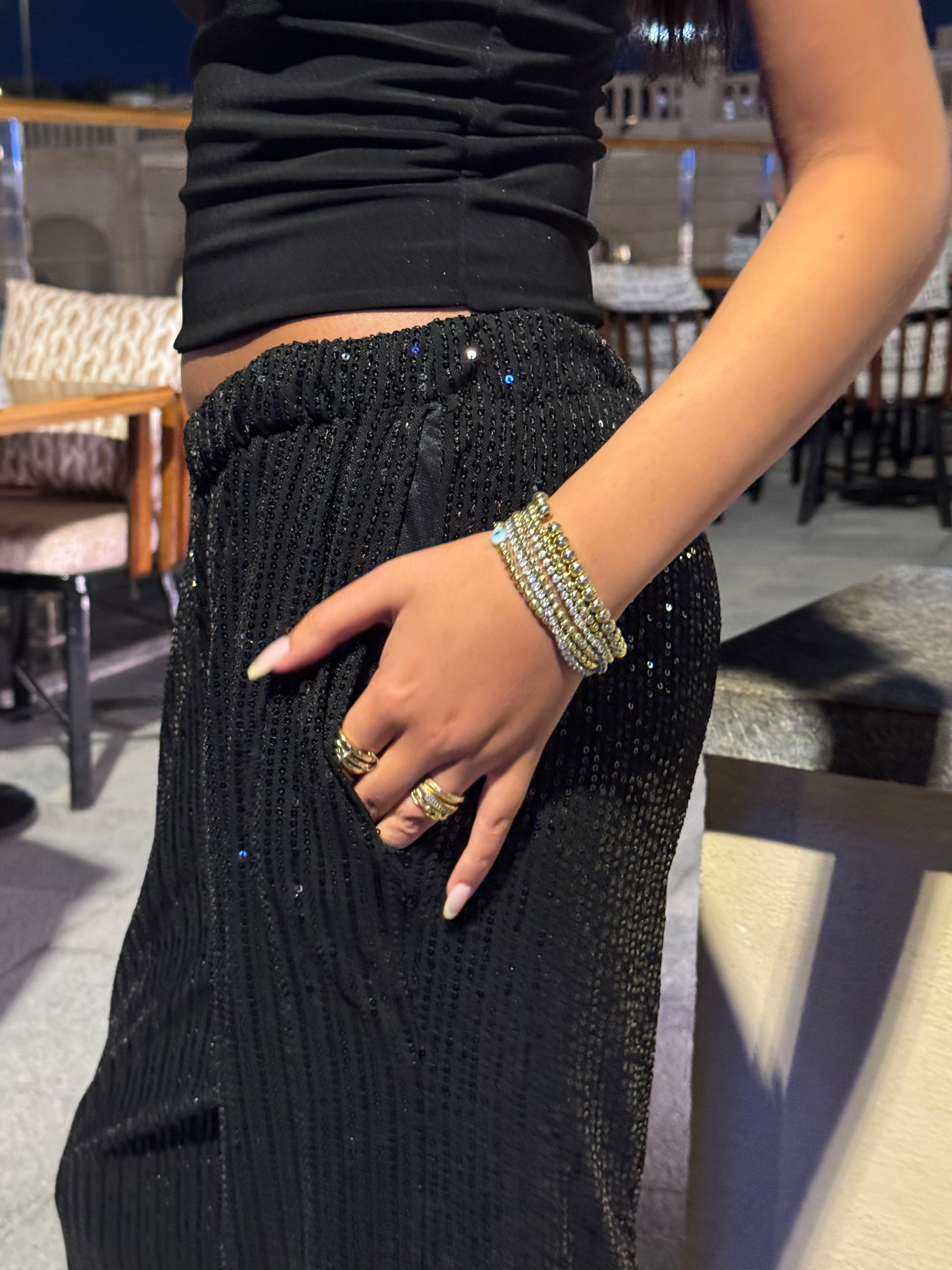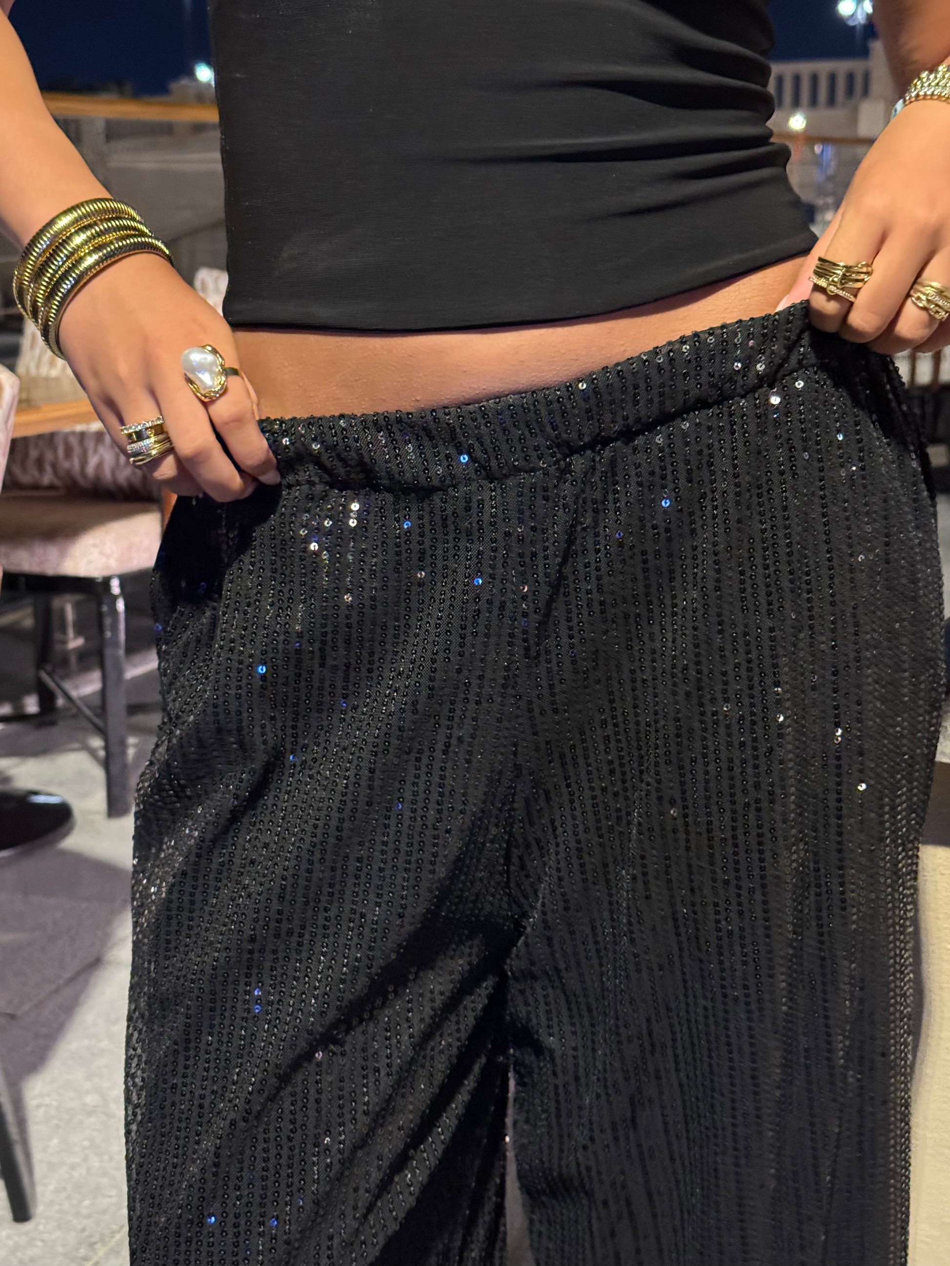 Step into effortless elegance with our Noir Sparkle Pants - a one-size statement piece designed to fit up to 75 kg. These black wide-leg pants shimmer subtly with sequin detailing, catching the light just right for evenings out or chic lounge looks. The stretchy waistband ensures comfort without sacrificing style.